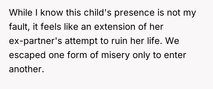 Can a relationship survive when one partner’s primary caregiving burden, stemming from prior abuse, directly prevents the other partner from fulfilling their desired role as a parent and achieving personal well-being, forcing a choice between profound personal sacrifice and abandoning a vulnerable family unit?