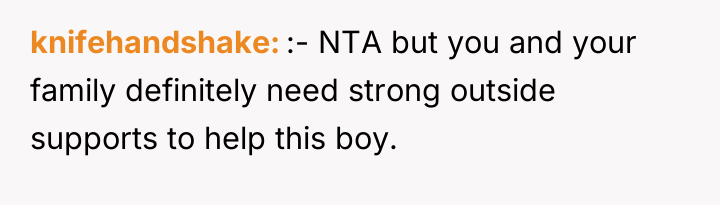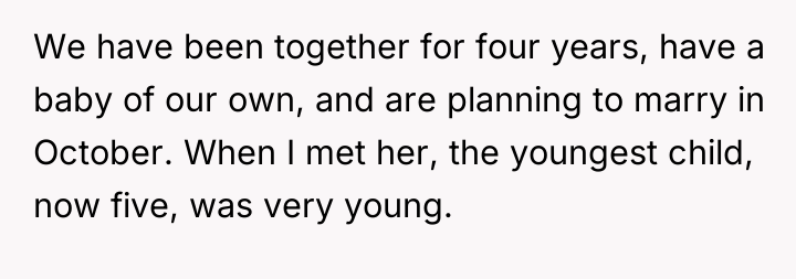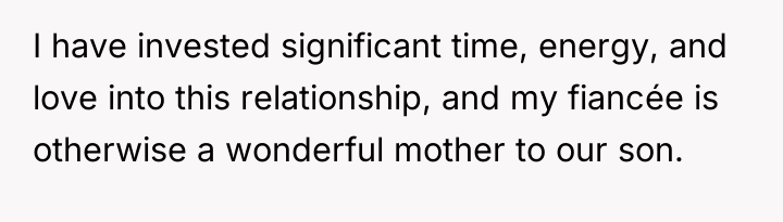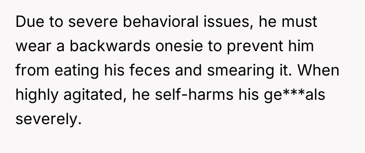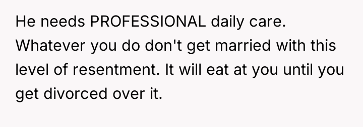 The partner's feelings of resentment and the desire to escape, though framed as feeling like an 'asshole,' are understandable reactions to immense, uncompensated emotional and physical labor. The partner's love for the fiancé and the other children is being eroded by the constant crisis management imposed by the stepson's severe needs. A constructive path forward requires immediate, external respite care to alleviate the daily pressure, followed by couples counseling focused not on the child's condition, but on establishing clear, non-negotiable boundaries regarding caregiver roles and emotional support for both adults.