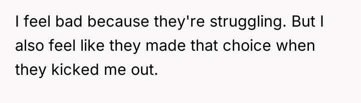 The individual is experiencing intense conflict between feeling sympathy for their parents' resulting financial hardship and upholding the boundary set by being forced out of their home due to their identity. The core struggle lies in reconciling the emotional obligation felt toward family with the self-preservation required after an act of rejection.