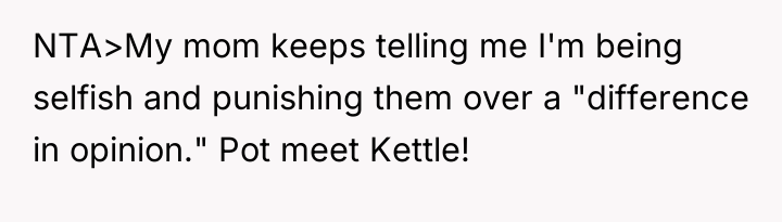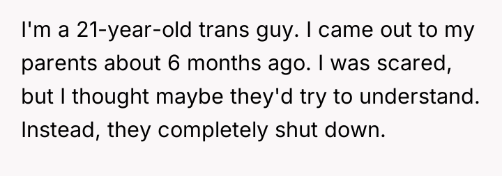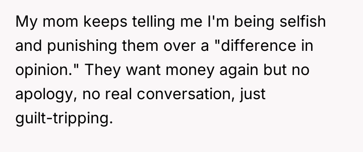 The parents' actions—kicking out their dependent child upon learning about their gender identity and simultaneously relying on that child for financial stability—demonstrate a severe breakdown in boundaries and a transactional view of the parental relationship. They prioritized their discomfort with the OP's identity over the basic needs of their child, creating the very crisis they now blame the OP for. The mother's framing of the situation as the OP 'punishing them over a difference in opinion' is a classic example of DARVO (Deny, Attack, and Reverse Victim and Offender), deflecting responsibility from their decision to enforce an expulsion.
