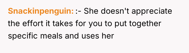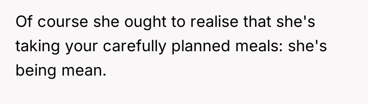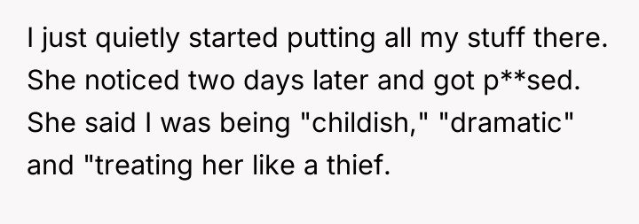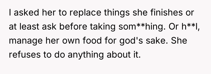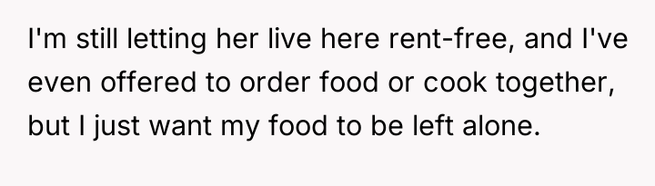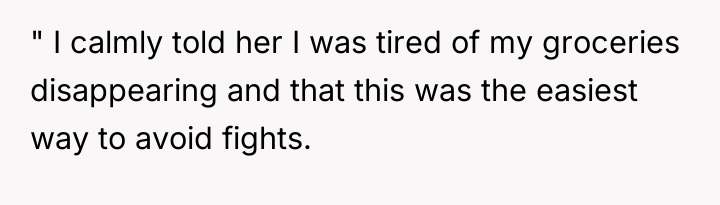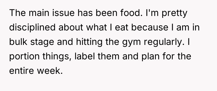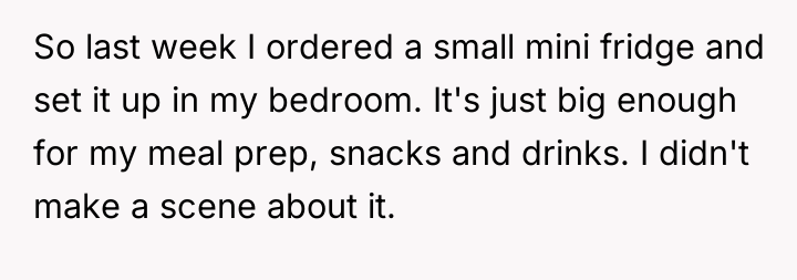 The OP's action (securing his food) was appropriate as a final, low-conflict measure to protect his deeply personal investment (time, money, and discipline for fitness goals). A more effective approach in the future, once the mini-fridge was in place, would be to re-frame the conversation by focusing solely on the boundary, not the food itself. For instance: 'I understand you are stressed, but my meal prep is essential for my health goals. The new fridge ensures we both have the space we need without arguments. This separation is necessary for our living situation to remain positive.'