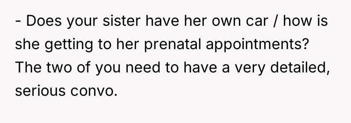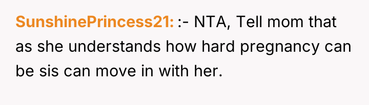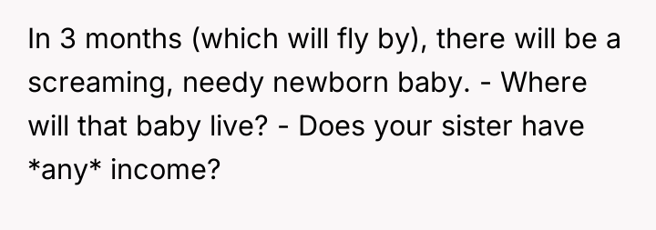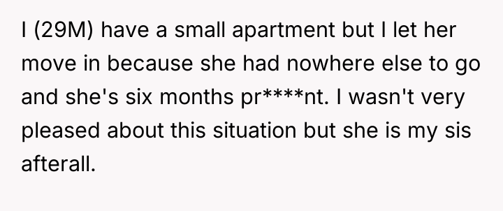 The individual is caught between supporting a pregnant sister during a difficult life transition and maintaining personal boundaries regarding shared living space and resources. The core conflict lies in the sister's continued disregard for the brother's labeled, planned food supply, leading him to take protective measures that the sister perceived as aggressive or uncaring.