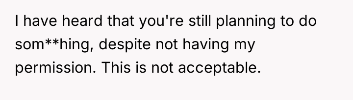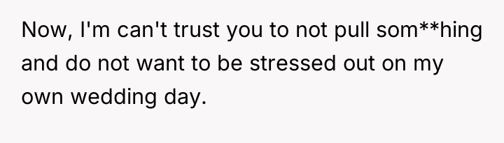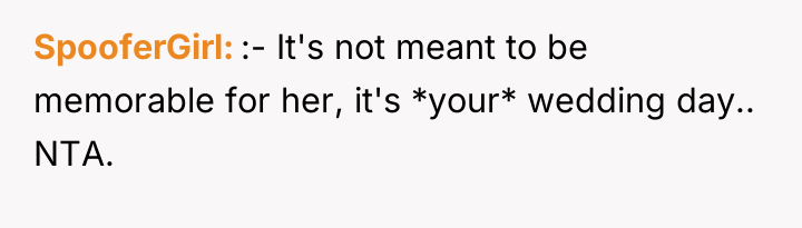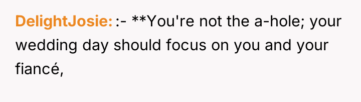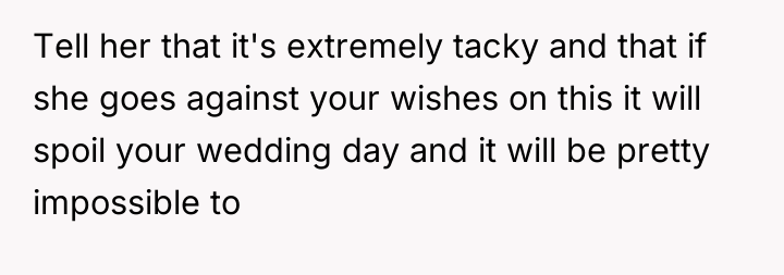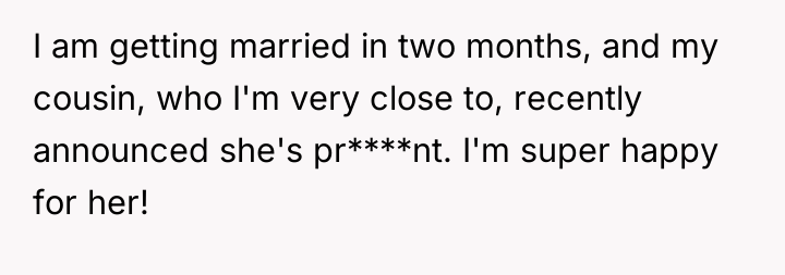 The potential for the cousin to attempt an unauthorized reveal heightens anxiety, indicating a potential disregard for the OP's stated 'no.' The OP's action of saying no was entirely appropriate as it defended the sanctity and focus of their wedding day. Moving forward, the constructive recommendation is to communicate clearly and firmly with the cousin (perhaps with the fiancé present) about the non-negotiable nature of the wedding focus, and to discreetly inform the wedding coordinator or venue manager about the potential for an unsanctioned announcement, ensuring contingency plans are in place to maintain control of the reception flow.