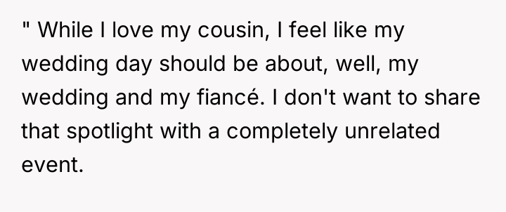 The original poster (OP) is experiencing significant stress due to a conflict between honoring their deeply personal wedding milestone and accommodating a close cousin's significant life event. The core struggle lies in the OP prioritizing the intended focus of their celebration versus succumbing to family pressure arguing for a shared, memorable moment.