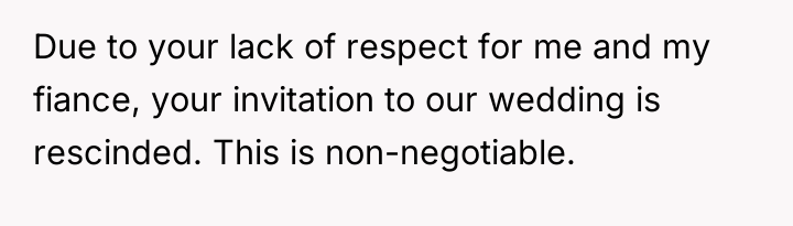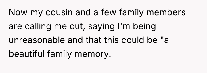 The OP's emotional response—feeling guilty despite being firm—is common when confronting demands that cross established personal limits, especially under social scrutiny. The cousin's framing of the request as essential for a "beautiful family memory" is a form of emotional leverage, shifting the focus from the OP's right to control their event to the OP's perceived lack of support for the cousin. The fiancé's unified support is a strong positive factor, validating the OP's need for an event centered on their union.