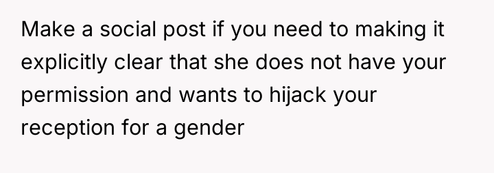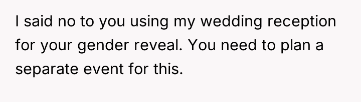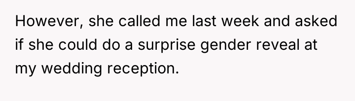 AITA for not wanting to include my cousin’s surprise gender reveal during my wedding reception?