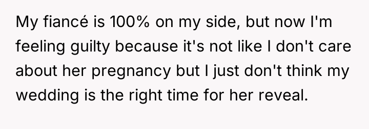 Given the clear desire for a wedding focused solely on the marriage, yet facing accusations of selfishness from family members, the central question remains: Does a significant family celebration like a wedding inherently require sharing the focus with other major personal announcements, or is maintaining the intended theme and spotlight for the primary event a justifiable boundary?