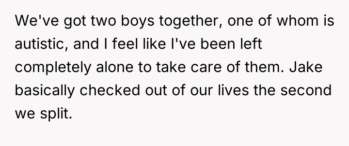A mother’s heart aches in silence as she battles the overwhelming weight of raising two boys alone, one of whom requires extra care due to autism. While she juggles work and endless responsibilities, her ex-husband drifts further away, absent in both presence and support, leaving her to shoulder the burden with no relief.