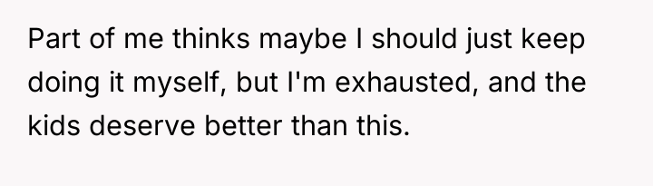 The narrator is experiencing severe emotional and physical exhaustion due to single-handedly managing the responsibilities of raising two children, one of whom has special needs, while the ex-husband provides minimal support. Her central conflict lies between her established pattern of enduring this unfair burden alone and the necessity of taking firm legal action to secure the support her children require.