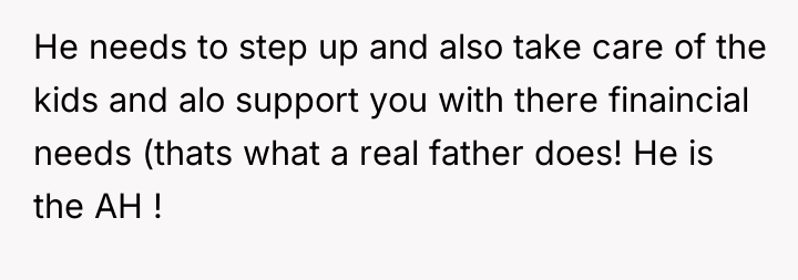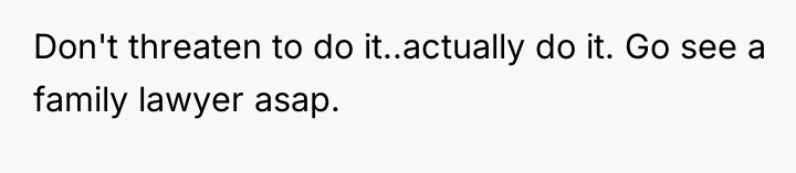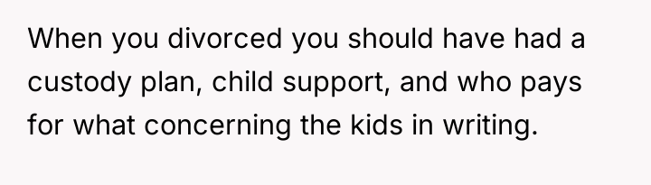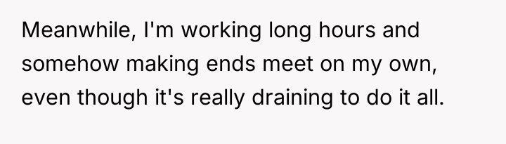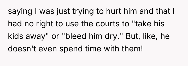 The mother’s motivation stems from legitimate burnout and a desire to protect her children's future needs, particularly financial stability, which is emphasized by the ex-husband's perceived irresponsibility contrasted with his visible leisure activities. The threat of legal action, while escalating the conflict, serves as a necessary assertive behavior to address systemic non-compliance. The ex-husband's reaction, accusing her of trying to 'hurt him' or 'bleed him dry,' suggests a pattern of defensiveness and avoidance, framing his financial obligation as a punitive measure rather than a duty to his children.