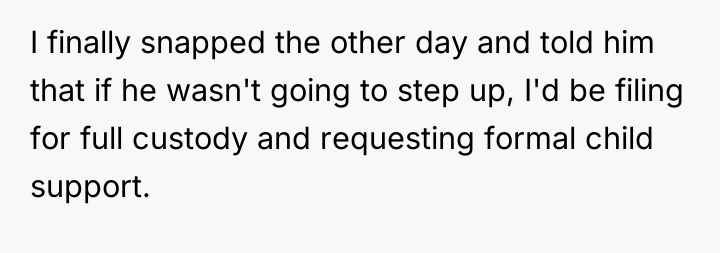 Is the narrator justified in using the threat of legal action (full custody and formal child support) as a final boundary enforcement against an absent co-parent, or does this escalation cross a line, potentially causing unnecessary conflict without guaranteeing better involvement from the father?