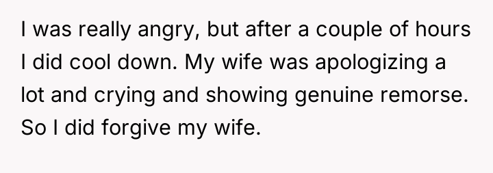 The husband's initial anger followed by forgiveness shows a capacity for reconciliation, but the immediate cancellation of the family vacation serves as a form of punishment rather than constructive boundary setting. This punitive action, even if born from deep hurt, can foster resentment rather than true repair, as the wife is forced to accept consequences without a joint strategy for moving forward. The wife displayed appropriate behavior by admitting the transgression and showing remorse; however, the husband’s response bypassed direct negotiation about rebuilding trust.