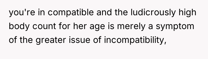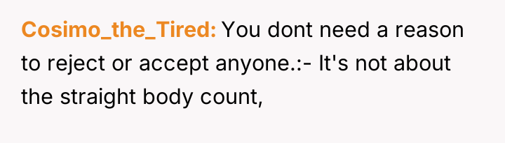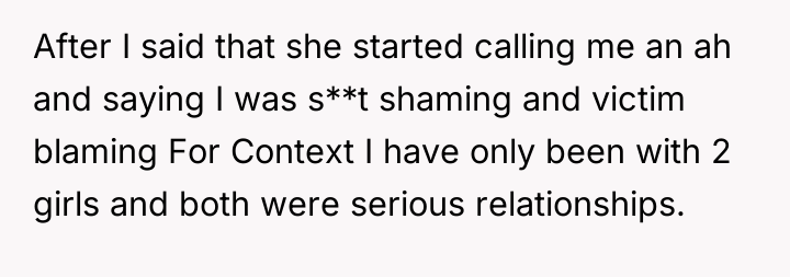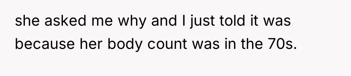The user's response, citing a body count in the 70s as the sole reason for declining a date, directly invokes this judgment. While an individual is always free to choose who they date based on personal comfort levels, vocalizing this specific statistic often shifts the dynamic from a personal preference to an accusation of promiscuity, leading to feelings of shame and defensiveness in the other party. The friend reacted strongly because the stated reason feels like slut-shaming, which is a common social response when one's lifestyle is aggressively scrutinized by someone they consider a peer. The user's limited experience (two serious relationships) is irrelevant to the judgment he passed on her history, highlighting a potential double standard.
