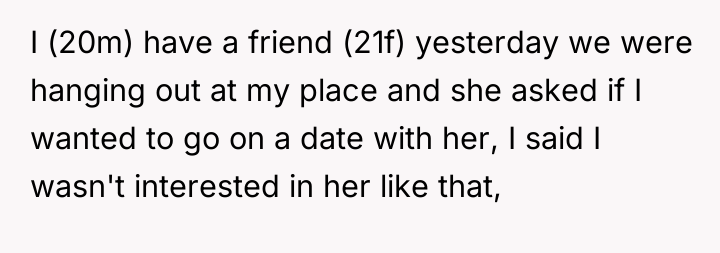 The individual in this situation faced a direct romantic rejection from a friend, which then escalated into a conflict regarding the reasons provided for that rejection. The central issue revolves around the friend's strong negative reaction to being judged based on her past sexual history, contrasting with the user's belief that this history was a valid reason for his lack of interest.
