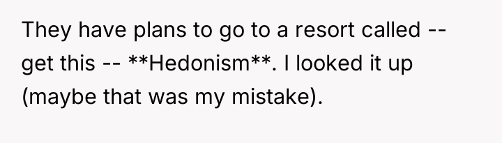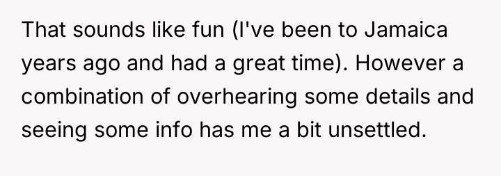 Yet, beneath this joy lies a flicker of unease. The destination chosen by his boys—a resort named Hedonism in Jamaica—stirs a quiet storm of concern in his heart. What began as excitement for their adventure now wrestles with apprehension, as he grapples with the unknown facets of their plans, caught between trust in his sons and the instinct to protect them from the shadows that lurk beneath the surface.