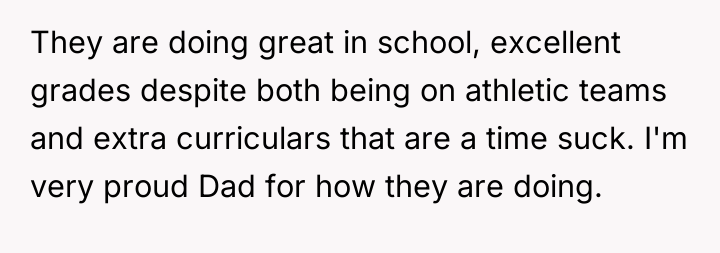 A proud father watches with admiration as his two sons, balancing the demanding worlds of academics and athletics, excel beyond expectations. Their hard work and dedication shine through their excellent grades and busy extracurricular lives, filling him with immense pride and prompting a special reward: a spring break vacation of their choosing, a celebration of their achievements and a chance to create unforgettable memories.