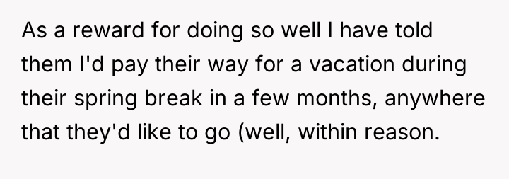 A constructive recommendation would involve establishing clearer financial parameters upfront for high-value rewards. For future situations, the father should agree on a budget and general type of trip (e.g., 'an all-inclusive beach trip') and then collaboratively veto specific locations as a family before booking. In this instance, since the promise was made, the father should fulfill the financial commitment but clearly state that this specific venue crosses his personal line, thereby separating the reward for achievement from the specific activity funding. Moving forward, he should focus on rewarding effort and success generally, rather than funding specific, potentially controversial, youth-driven plans.