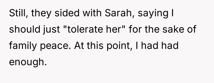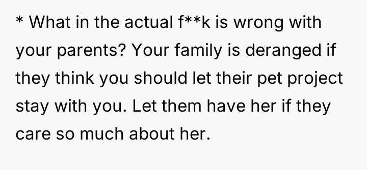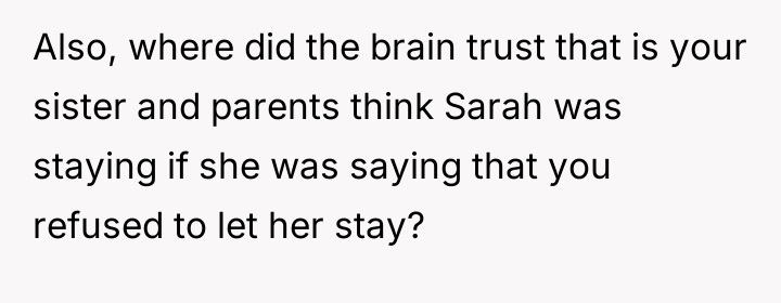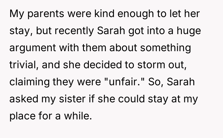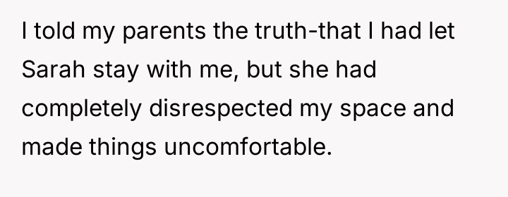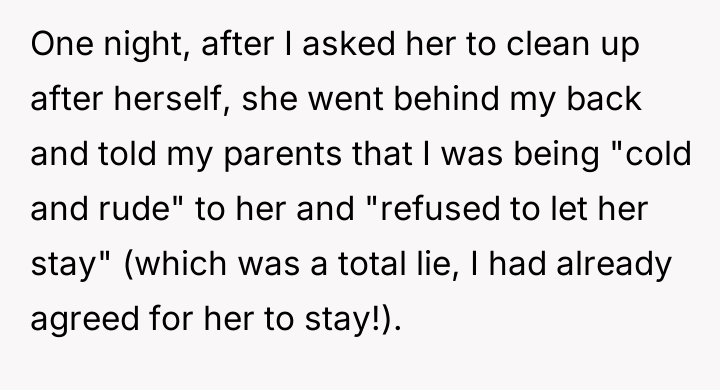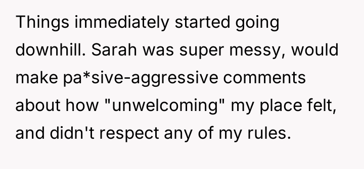The core motivation for the Original Poster (OP) was maintaining control over their personal environment and refusing to be subjected to emotional labor or manipulation by Sarah. Sarah’s behavior—messiness, passive-aggressive comments, and outright lying to authority figures (the parents)—demonstrates a clear disregard for the OP's autonomy and hospitality. When the OP's parents sided with Sarah, they inadvertently validated the manipulative tactics and placed the OP in an untenable position, forcing them to choose between their boundaries and family approval.