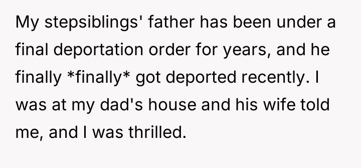 The poster's actions were appropriate given the context of sustained mistreatment experienced by their step-siblings. Constructively, future discussions with the friend should focus on the principle of accountability: consequences follow actions. If the friend remains concerned about the destination's safety, that concern should be directed toward advocacy for reformed deportation procedures rather than invalidating the victims' relief.