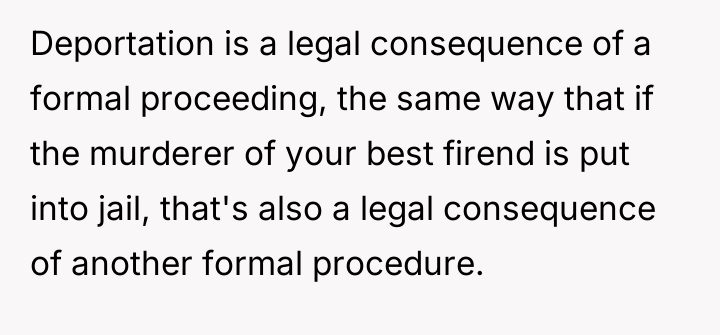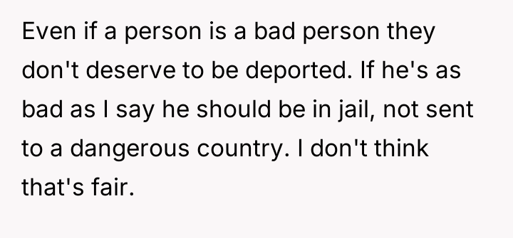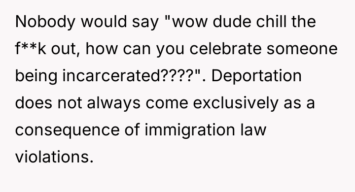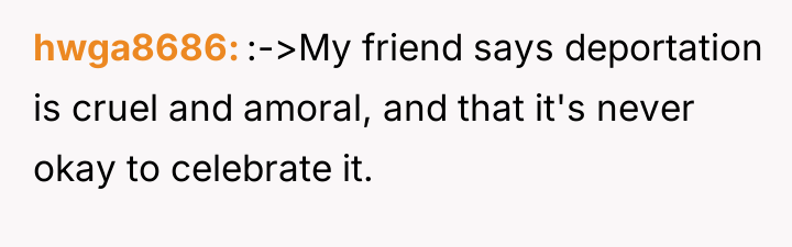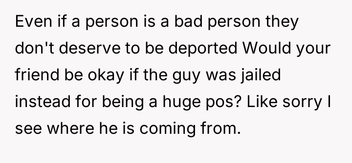 The conflict here lies between two ethical frameworks. The poster operates from a position of protecting immediate family well-being, viewing the deportation as a necessary and long-overdue consequence that resolves an ongoing threat. The friend operates from a more deontological view, arguing that the process of deportation, especially to a potentially dangerous location, is inherently cruel and morally wrong, irrespective of the deportee's character. This latter viewpoint often overlooks the concept of accountability for past harm and minimizes the emotional labor expended by the victims.