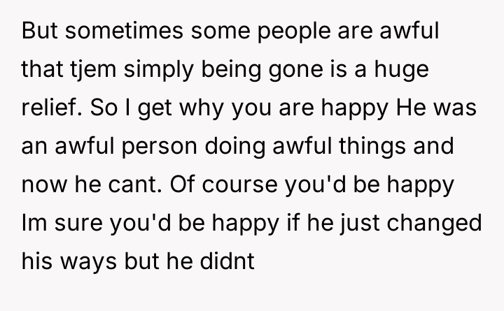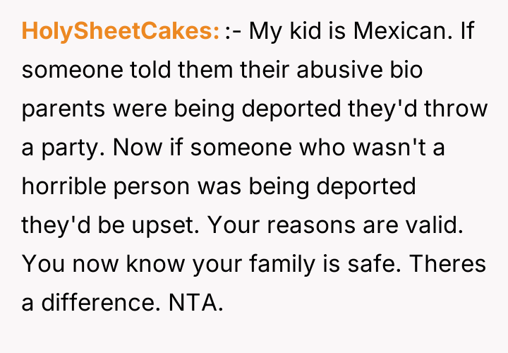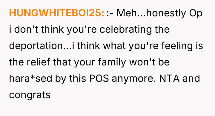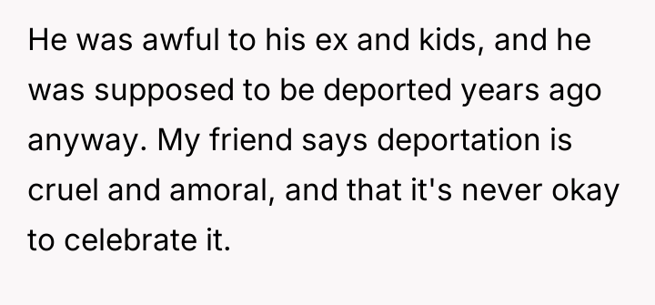 The original poster experienced deep relief and celebrated the legal removal of an abusive figure from their family's life, conflicting sharply with their friend's absolute moral stance against celebrating deportation, regardless of the individual's past actions.