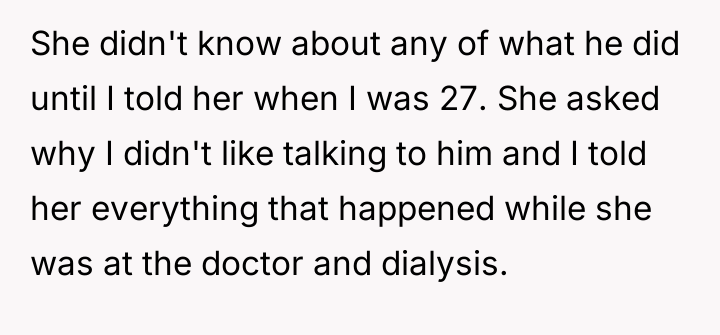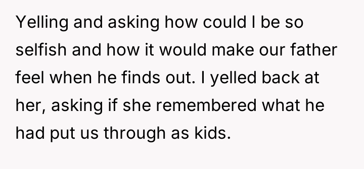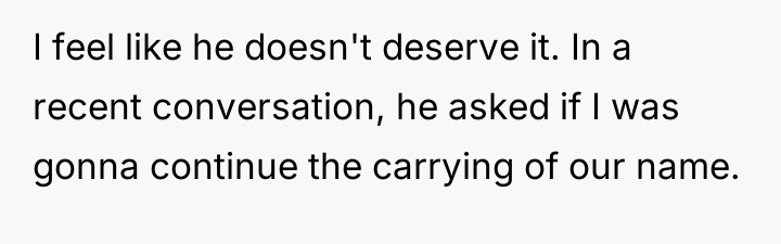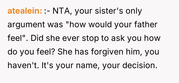 The individual felt deep emotional hurt from years of abandonment by his father, leading to a firm decision to sever ties by changing his surname. This action, though intended as self-protection, directly conflicted with his sister's path toward reconciliation and her expectation that he should consider his father's feelings.