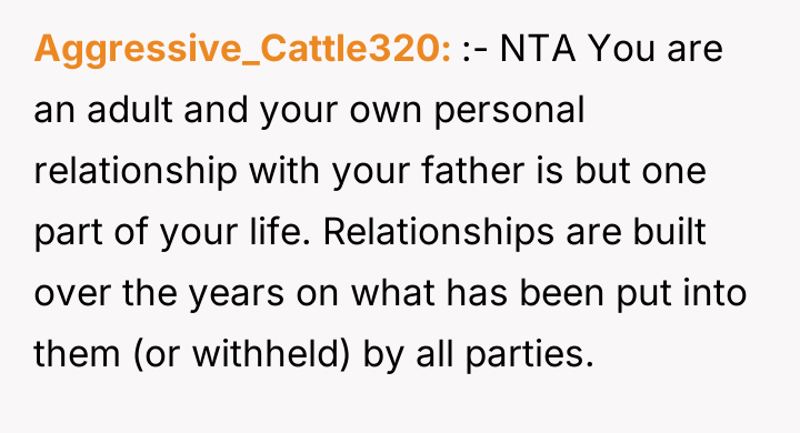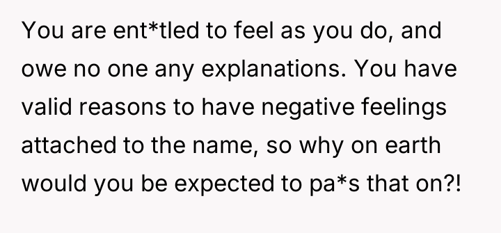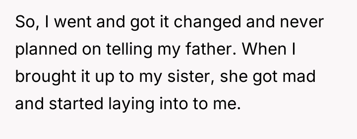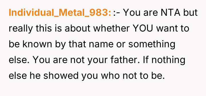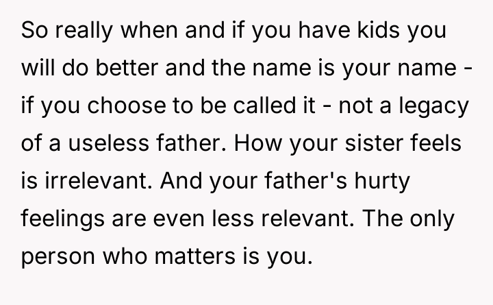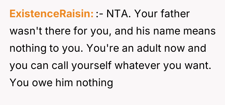 The narrator's action of changing his name was appropriate for his need for emotional closure and autonomy, especially given the father's lack of accountability (as seen when he blamed the mother for not dictating parenting styles). A more constructive approach for the future would involve communicating the 'why' of the name change to the sister clearly, emphasizing that this is about his personal healing process, not an attack on her relationship with their father, thereby managing the sibling relationship separately from the parental conflict.