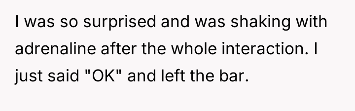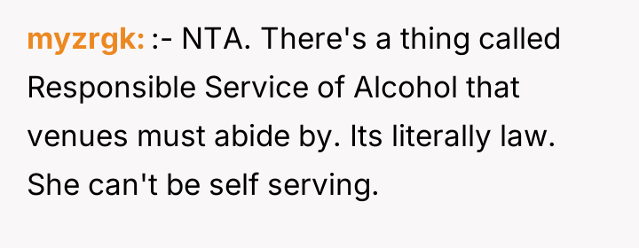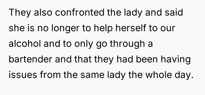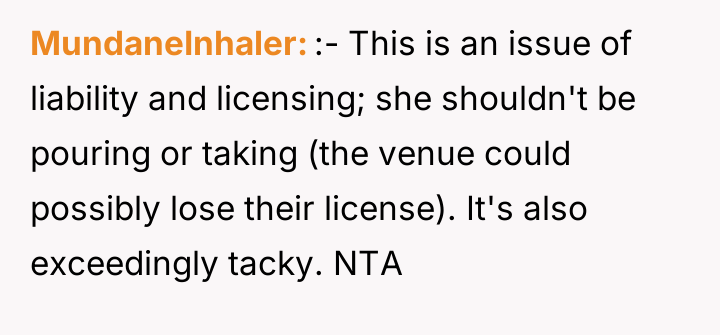 The bartender’s motivation was primarily professional accountability. As an employee, their primary duty during service hours is to adhere to liquor laws and venue policies, which often strictly prohibit self-service, regardless of who the person is. The step-mother displayed a clear boundary violation, confusing her role as a family member with the right to access restricted areas and supplies. Her reaction—accusing the bartender of being 'a bitch'—is a common defensive tactic when authority is challenged, shifting the focus from her transgression to the enforcer's demeanor.