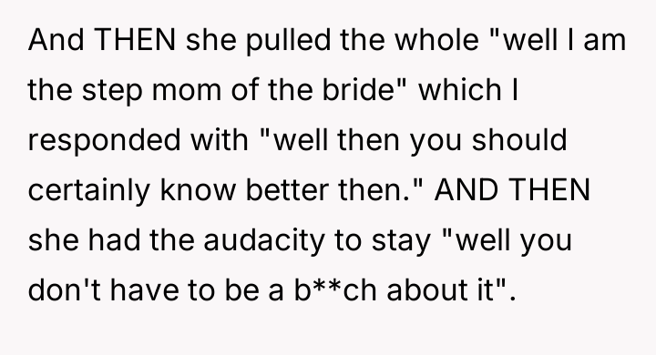 The individual in this situation held a clear professional boundary regarding service policies and was confronted when enforcing those rules upon a guest, the step-mother of the bride. The core conflict arose from the guest using her relationship status to justify bypassing established service rules, leading to a confrontation about authority versus entitlement.