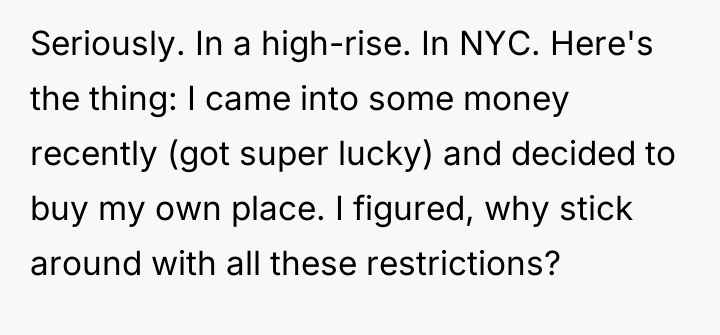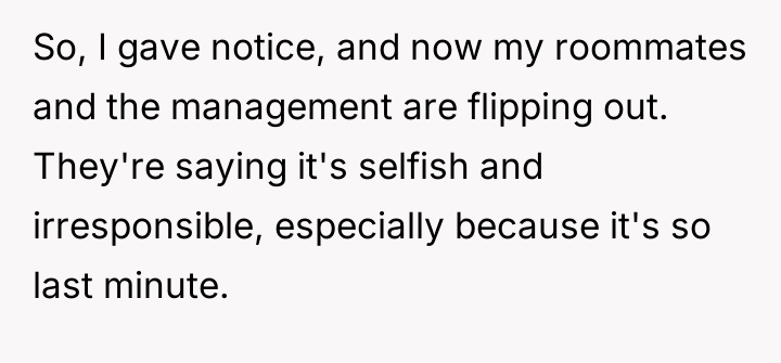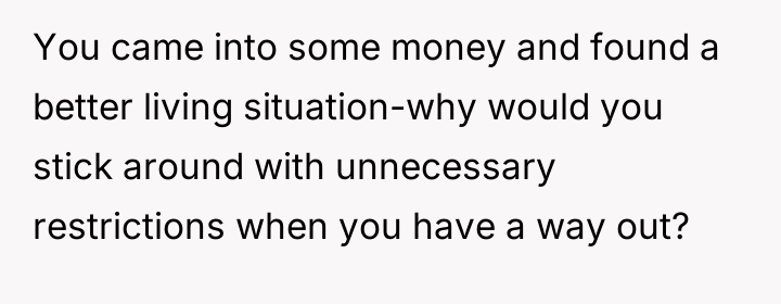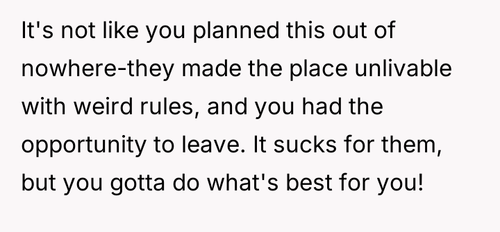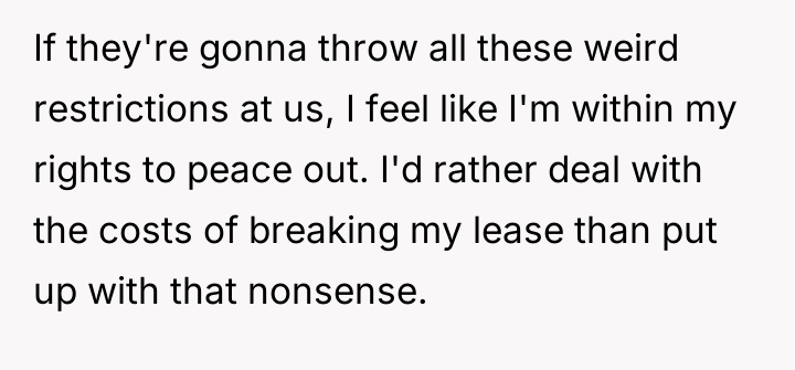 The individual felt compelled to leave their living situation due to severe, unexpected restrictions imposed by the building management. This action, while understandable from the perspective of personal freedom and avoiding unreasonable rules, has caused significant disruption and negative reactions from roommates and management.
