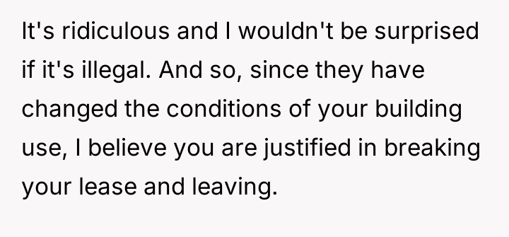 From a professional standpoint, the resident's reaction to the policy change was an understandable response to extreme imposition. However, the execution was flawed. A more constructive approach would have been to first formally challenge the lease amendment based on constructive eviction principles (if applicable in that jurisdiction) or to negotiate an early buyout that factored in the inconvenience caused, rather than simply announcing an immediate departure. Future actions should prioritize transparent communication and mutual negotiation when faced with severe, unilateral changes to living conditions.