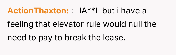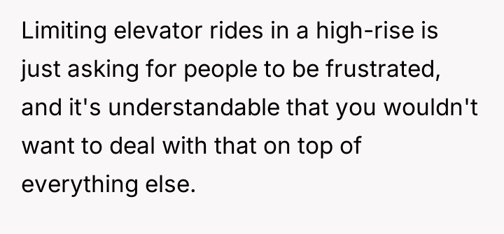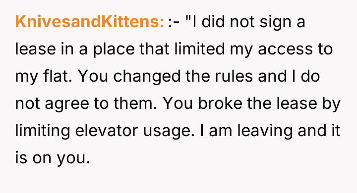 The core conflict here involves a breakdown of the social contract implicit in renting a high-rise apartment. The resident perceived the new elevator policy as a fundamental violation of the expected utility of the dwelling, triggering a strong emotional reaction that prioritized immediate escape over adherence to the remaining lease term. While the resident acted quickly upon securing new resources (purchasing a place), the timing created significant negative externalities for the roommates and management, leading to accusations of selfishness. This demonstrates a classic tension between individual rights (the right to choose where and how one lives) and contractual obligations (the lease agreement).