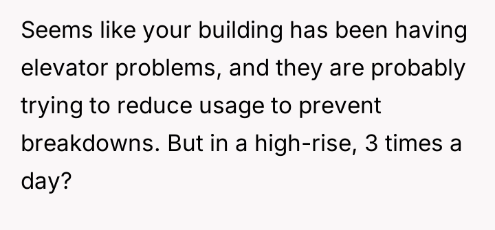 Dr. Sherry Turkle, a professor at MIT who researches technology and human relationships, often discusses how technology and imposed systems can erode feelings of privacy and control, leading to resentment and a desire to escape the controlling environment. The building management’s implementation of a three-ride-per-day elevator limit acts as a pervasive, daily micro-aggression against the resident's autonomy and sense of normal living in a high-rise.