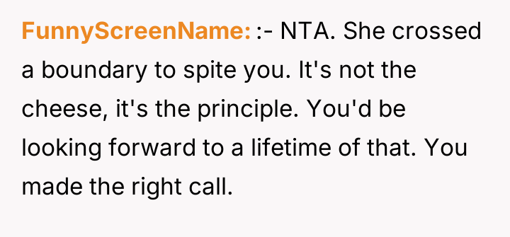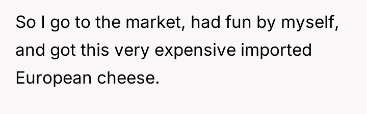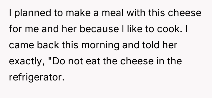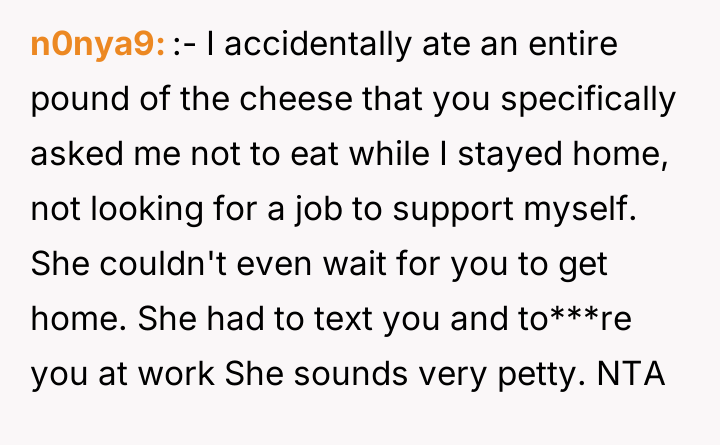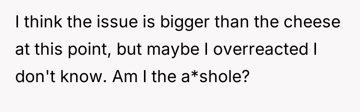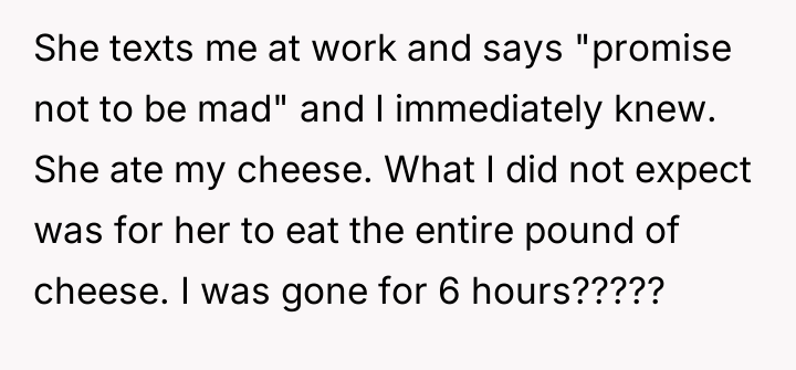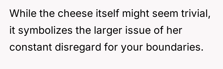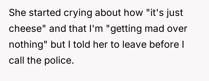 The girlfriend’s behavior—consuming the entire specialized item despite a direct, justified warning—is a clear demonstration of entitlement and a lack of impulse control within the partnership structure. Her subsequent emotional response (crying) when confronted, followed by minimizing the action ('it’s just cheese'), is a classic manipulation tactic known as DARVO (Deny, Attack, and Reverse Victim and Offender). This tactic shifts the focus from her transgression to the user’s reaction, escalating the conflict and avoiding accountability.
