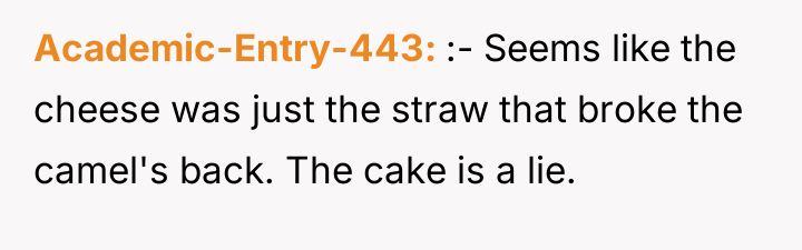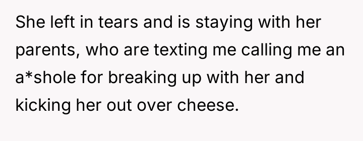 The user’s decision to terminate the living arrangement was an attempt to enforce a boundary that the partner had demonstrated an inability or unwillingness to respect over five months. While calling the police might be an overreaction to the immediate situation, the underlying issue is not the cheese but the established power dynamic and disrespect. A constructive recommendation moving forward, if reconciliation were considered, would involve establishing a formal, written agreement on shared resources and establishing consequences for boundary violations, monitored by couples counseling to address the underlying entitlement issues.