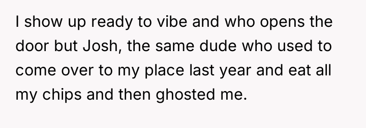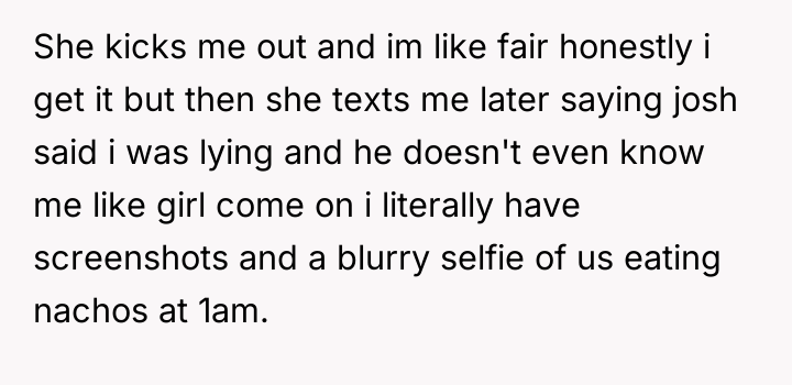 The poster's motivation appears to be rooted in self-preservation and perhaps a sense of justice regarding Josh's prior ghosting and current denial. When Josh attempted to gaslight the situation by pretending not to know the poster, he escalated the dynamic from an awkward coincidence to an active deception. Claire's immediate reaction—kicking the poster out and then believing Josh's subsequent denial—suggests she prioritized avoiding immediate conflict or protecting her two-year narrative over investigating the claim, which is a common defense mechanism when faced with uncomfortable truths about a long-term partner.