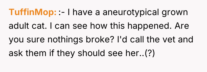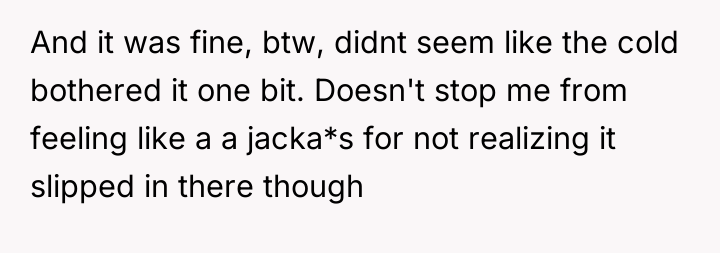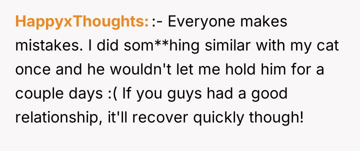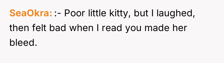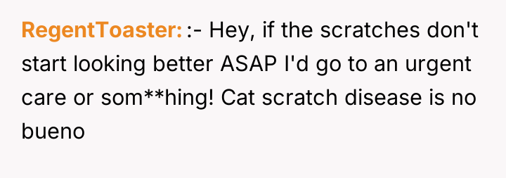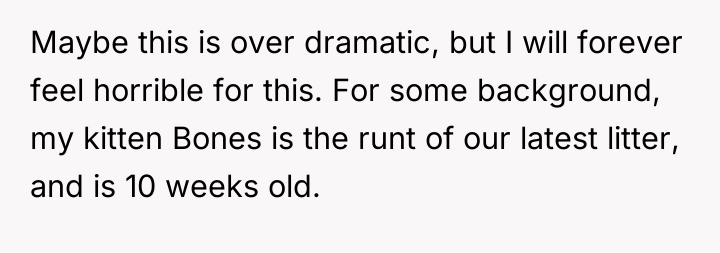 The individual experienced intense guilt and distress immediately following the accidental injury of their kitten, viewing the resulting infection from the scratches as deserved punishment. Despite the kitten, Bones, recovering physically and returning to normal behavior, the original poster remains deeply affected by their moment of carelessness and has committed to increased lifelong care as amends.