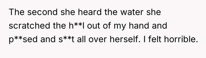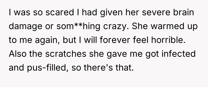 The primary psychological dynamic at play is acute remorse coupled with self-blame. The owner's reaction—panic, immediate attempts at care, and subsequent self-flagellation (feeling they 'deserve' the infected scratches)—suggests a high level of emotional investment in the pet's welfare. While the intent to care is positive, the extreme reaction indicates a difficulty in separating a single, severe error from their overall identity as a caregiver. The kitten's unique vulnerability (being the runt, neurological differences) amplified the perceived severity of the mistake.