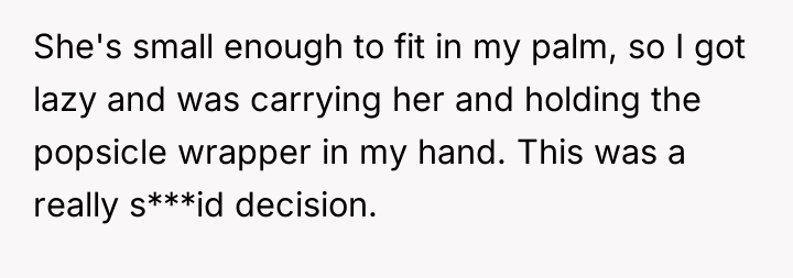 The owner's subsequent actions, which involved seeking immediate veterinary consultation (including a second opinion) and committing to proactive health monitoring (checking for neurological issues like Cerebellar Hypoplasia), demonstrate responsibility overcoming the initial panic. While the initial act was careless, the corrective trajectory is appropriate. The recommendation for future situations is to practice 'mindfulness' during routine tasks involving fragile creatures, ensuring that managing one item (the wrapper) does not compromise the secure handling of the other (the kitten).