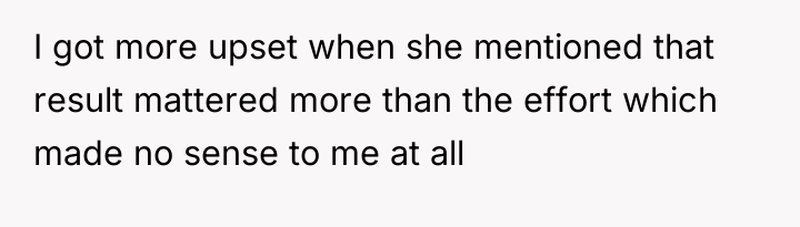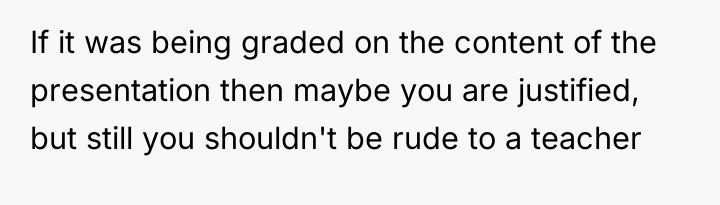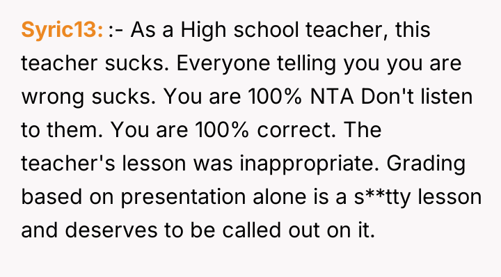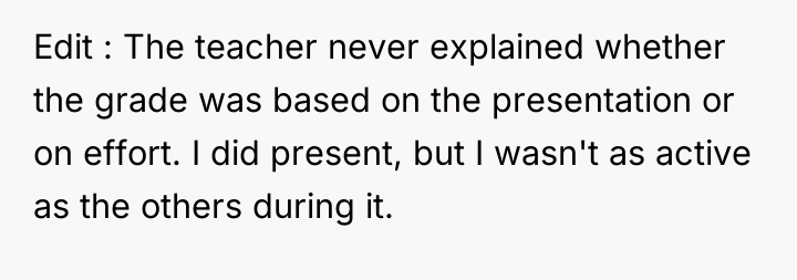 While the OP's initial reaction to the low grade was understandably emotional, confronting the teacher publicly and demanding a grade adjustment based on perceived effort (rather than performance metrics) escalated the situation poorly. A constructive recommendation would be for the OP to request a private follow-up meeting, focusing only on understanding the teacher's grading rubric for future assignments, rather than rehashing the past grade. They should seek clarification on how effort can be demonstrated within the 'presentation' framework next time, advocating for their needs respectfully while accepting the teacher's authority over the current grade.