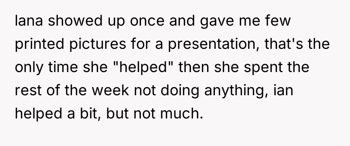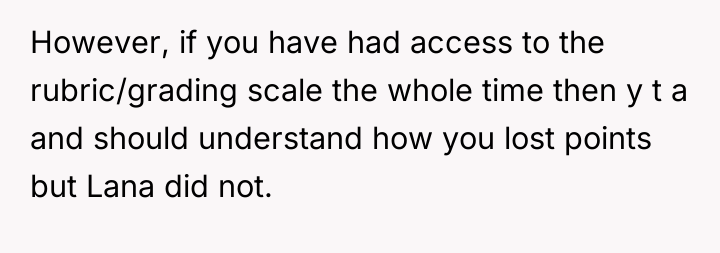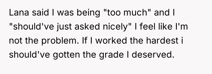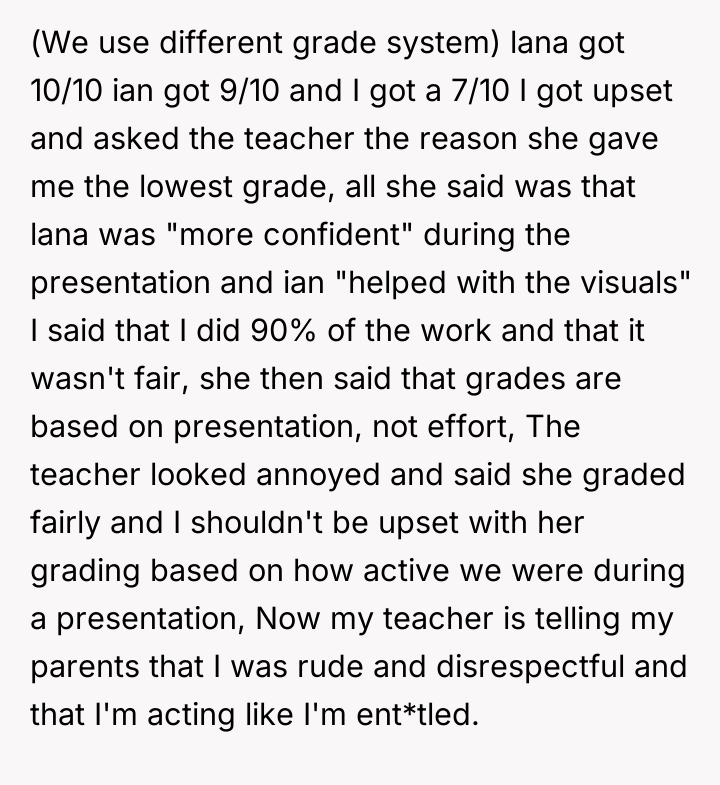 The core conflict here lies in mismatched expectations regarding grading transparency and the definition of 'success.' The OP operated under the assumption that effort and output would be weighted fairly, while the teacher explicitly prioritized performance metrics ('how active we were during a presentation'). When the OP confronted the teacher, their justified grievance was reframed by the teacher and peer (Lana) as rudeness or entitlement. This dynamic shifts the focus from the unfair grading policy to the OP's communication style, which is a common tactic in boundary violations—discrediting the messenger rather than addressing the message.